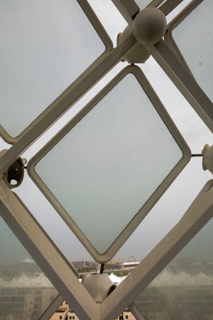 From Masdar, I took another taxi to Yas Island, to visit the building that put the American office Asymptote on the map: the Yas Viceroy Hotel, located within the Yas Marina F1 Race Circuit. The hotel is composed of two buildings, one set within the circuit and the other within the marina. A bridge connects both buildings and crosses the race track below. The most striking feature of the compound is the Grid Shell structure roof, a flowy steel and glass structure that covers all buildings, illuminated by thousands of LED lights operated independently.