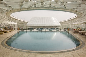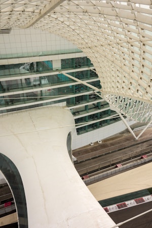 The hotel has several areas open to the public. You can take the elevator in the lobby of the circuit tower all the way to the 9th floor to enjoy a view of the roof terrace and the swimming pool. Going back to the second floor, you can cross the bridge to the marina building, where another elevator can take you to another swimming pool on the 7th and 8th floors. This small tour offers you a glimpse of the interiors and a close-up of the Grid Shell structure, which is quite impressive. It also allows glances to the racing track below. I went on a cloudy morning, and the dirt accumulated on the white steel structure was obviously not that attractive. I believe the whole building livens up at night when the Grid Shell is illuminated. Or during the F1 season in November, obviously.